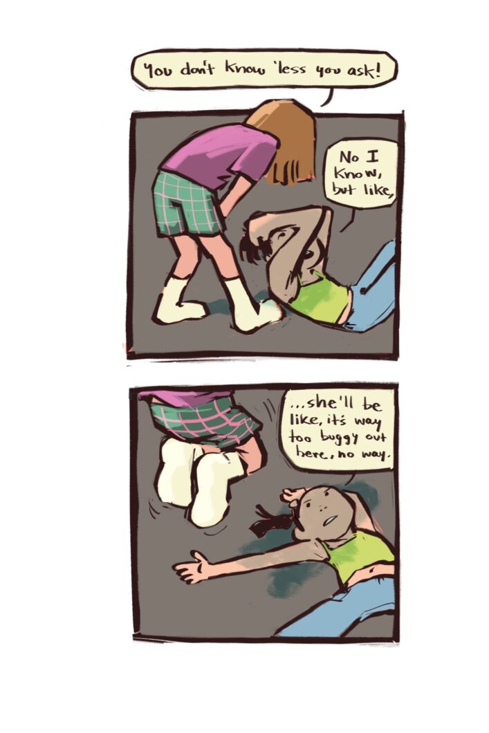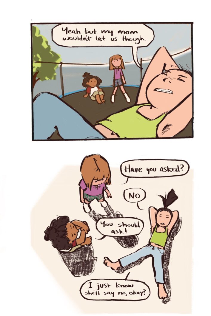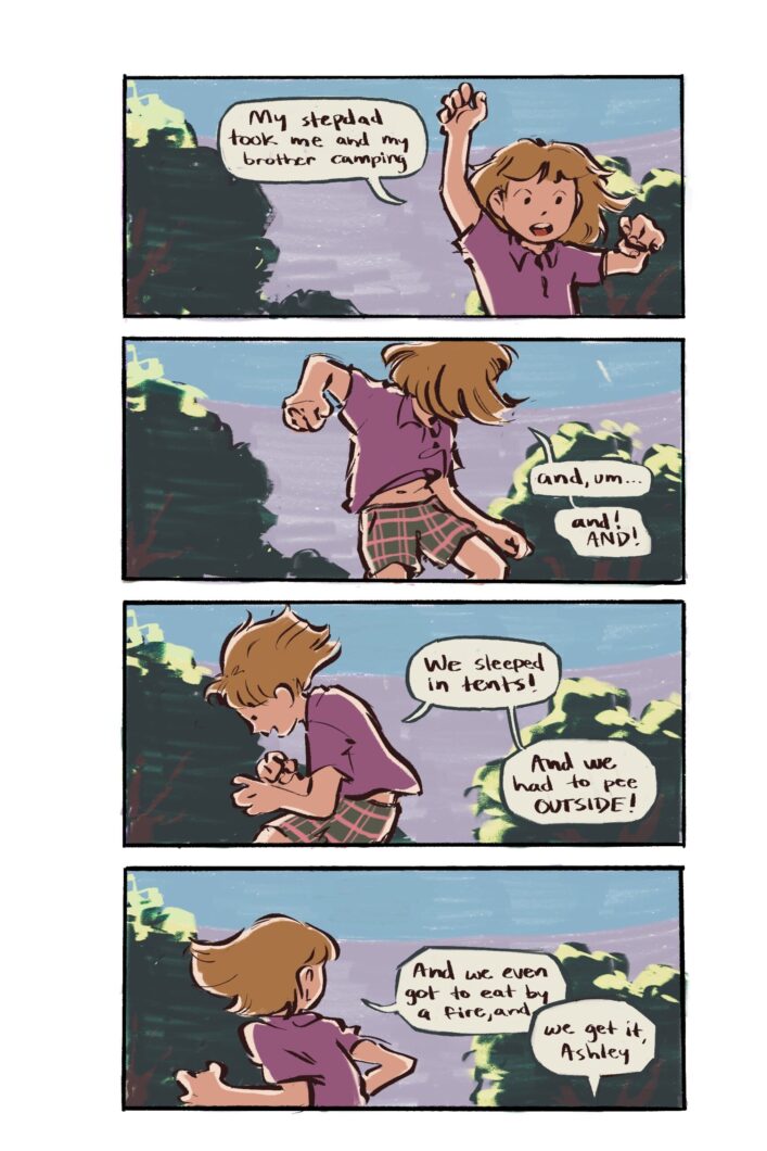 SOFA KING (excerpt). First edition featured in the 2023 ShortBox Comics Fair. 2024 MICE Mini-Grant awardee. Digital. 2024. DUNK, a slice-of-life comic about a summer’s day. Digital. 2022. MOTHERING, an autobio comic about creating. Mixed media. 2020. MATCHING (excerpt). Originally published in “SENSE”, a Center for Cartoon Studies anthology about the five senses. Digital. 2020. I CAUGHT A SEABASS! (excerpt). A nonfiction comic about fishing in video games. Digital. 2021. Full comic available here. TRAMPOLINE, select pages. Digital. 2022.